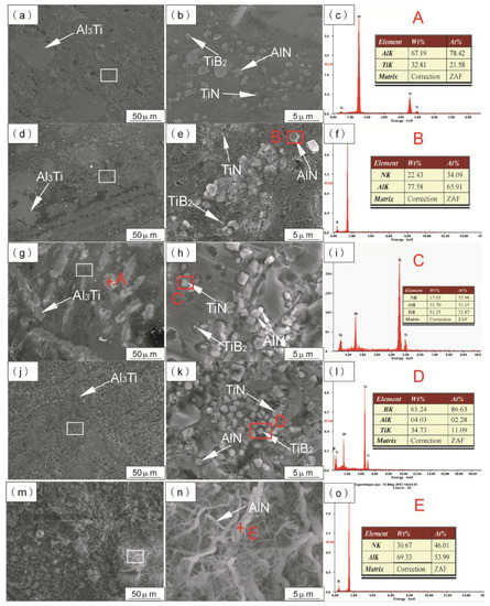 The microstructures and EDS analysis of in situ AlN-TiN-TiB2/Al composite inoculants are shown in Figure 3. From Figure 3a,b, it can be seen that sample A1 is composed of blocky-like Al3Ti phase and a few TiB2, AlN and TiN particles. The size of Al3Ti phases is about ~50 μm and the size of TiB2, AlN, and TiN particles is about ~1 μm. When the nitriding temperature is increased to 1373 K, the edge of blocky-like Al3Ti phases occurs bursting crack. Meanwhile, the content of AlN and TiN particles also increases slightly as shown in Figure 3d,e. From Figure 3g,h, it can be seen that A3 composite, which was synthesized by Al-8Ti-1B alloy at 1373 K with the nitriding time of 1 h, is composed of massive blocky-like Al3Ti phase and massive TiB2, AlN and TiN particles. The edge of blocky-like Al3Ti phases crack seriously in A3 composite and the size of Al3Ti phases decreases. The large increase in the content of blocky-like Al3Ti phase and TiB2, AlN and TiN particles are all ascribed to the increase of Ti content in alloy. As it was known, the shape of TiN, AlN, and TiB2 is square, hexagon and irregular, respectively [13]. Therefore, based on a combining consideration of the XRD results (Figure 2), the morphologies (Figure 3h,k) and the EDS results (Figure 3f,i,l), these particles can be confirmed as AlN, TiN, and TiB2 phases. When nitriding time increases to 2 h, the size of Al3Ti phase decrease to ~14 μm and a large number of TiN, AlN and TiB2 particles are homogeneously formed in the matrix with a size of ~1 μm as shown in Figure 3j,k. Figure 3m,n shows the SEM images of A5, namely, the hard shell in the upper part of the crucible. Combined with the XRD (Figure 2e) and EDS analysis (Figure 3o), it can be seen that the appearance of AlN phase shows a whisker-like shape, very different from the other four. In particular, the AlN whiskers are agglomerated to AlN binds with sizes ranged from nano-scale to micron scale due to the enormous surface energy.
