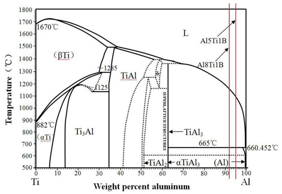 According to the binary Ti-Al alloys phase diagram as shown in Figure 5, Al-5Ti-1B melts at 1173 K and Al-8Ti-1B melts at 1373 K are located in the two-phase region (L + TiAl3), so there is equilibrium between phases, which can be expressed as: