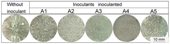 Optical images of Al samples after inoculation with different in situ AlN-TiN-TiB2/Al composite inoculants.