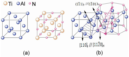 The lattice constants of Al and AlN are aAl (4.049 × 10−10 m) and aAlN (3.113 × 10−10 m), cAlN (4.981 × 10−10 m), respectively. It can be known that = 0.76876, = 1.6. According to the edge-to-edge matching crystallographic model [21], the match of crystal structures between FCC/HCP systems can be used to calculate the misfit of AlN/Al [22]. In this model, it is reasonable to use 10% and 6% as a critical value for the interatomic spacing misfit and the interplanar spacing misfit. Here, the misfit of //, // is 1.42% < 6%, 8.73% < 10%, respectively. They both meet the requirements of the critical value. Thus, it is suggested that in situ AlN particles are potential nucleation substrates of aluminum. Furthermore, Cui et al. [23] also found that there existed a crystal parallel relationship between AlN/Al: //. Figure 9 shows the crystal structures of Al, TiN and AlN. Figure 9b is the crystallographic model of Al and AlN. Thus, it is confirmed that in can nucleate and grow up along in .