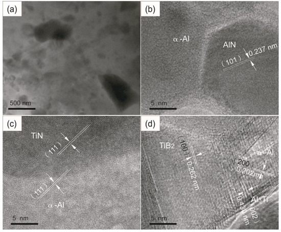Figure 10 shows interface microstructure of in situ formed TiN, AlN, and TiB2 particles. From Figure 10a it can be found that the ceramic particles have three different size of micron-scale, submicron-scale, and nanometer-scale. Figure 10b shows the interface feature between hexagonal AlN phase and α-Al phase. Figure 10c shows the interface feature between α-Al phase and in situ formed TiN phase, in which a clean interface is observed. Thus, a strong interfacial bonding of the matrix and TiN particles can be obtained. Figure 10d shows the interface feature between α-Al phase and TiB2 phase. It is found that an Al3Ti layer is formed on the surface of TiB2 particles during the grain refiner production process. This phenomena may significantly improve the potency of TiB2 for nucleation of the α-Al, according to the reported literature [24].