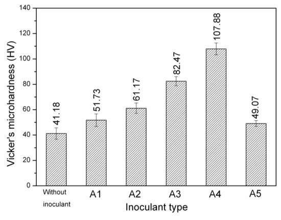 Figure 11 shows the microhardness values of the as-cast Al samples after inoculation with different inoculants. The microhardness values becomes higher and higher with the increased sample number from A1–A4. However, the microhardness values decreases when 0.3 wt % A5 is added into pure aluminum. In particular, the mcirohardness of alloys refined by adding 0.3 wt % A4, has reached up to 107.88 HV, which is improved 162% than that of pure Al without inoculation.
