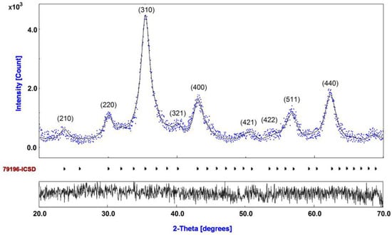 Figure 1 displays the peaks from representative diffraction pattern of sample studied. A good fit has been obtained by the Rietveld method using MAUD (Material Analysis Using Diffraction) [28]. The XRD analysis of DIO-NPs by Rietveld refinement of X-ray diffraction patterns have clearly identified a single phase of maghemite. On the other hand, the spinel cubic structure with Fd3m space group has been confirmed. The diffraction peaks corresponding to the Miller indices value (hkl) of (210), (220), (310), (321), (400), (421), (422), (511), and (440) agree with the cubic structure of maghemite (ICSD-PDF No. 79196) with a lattice parameter of 8.349 Å. As it was mentioned in previous studies on identification and quantification of magnetite–maghemite mixture using conventional X-ray diffraction technique carried out by W. Kim et al. [29], the magnetite and maghemite phases are difficult to differentiate when they coexist because they are very close. The lattice parameter calculated from the pattern play an important role in the establishment the magnetite or maghemite phase. The lattice parameter calculated in the present study was equal to 8.349 Å. Furthermore, if we compare value obtained for the lattice parameter calculated in the present study with those found in literature it can be seen a good agreement [30,31,32]. In good agreement with previous studies [33], the slight broadening of the diffraction lines can be interpreted in terms of small sized crystallites. The calculated particle size of DIO-NPs was estimated at about 7.08 nm. In the Figure 1, the observed data are represented in blue and the calculated data by a gray line. Vertical lines represent the positions of diffraction lines of maghemite. The line below the gray plot is the difference profile. It resulted that the DIO-NPs sample is constituted of spherical nanocrystallites. The standard R-factors and chi squared (χ2) quantities are the parameters which provide information about conventional goodness of fit. Generally, R-factors quoted in Rietveld refinement programs are expected R-factor (Rexp), weighted profile R-factor (Rwp), and Bragg R-factor (RB) [34,35]. The final R factors obtained from the analysis of the DIO-NPs were given by Rwp = 0.7189 (%) and Rexp = 0.6847 (%). The resulting Bragg R-factor (RB) and χ2 were 0.574 and 1.05. Theoretical values of R factors obtained for DIO-NPs are in good agreement with the theory of Toby [36].