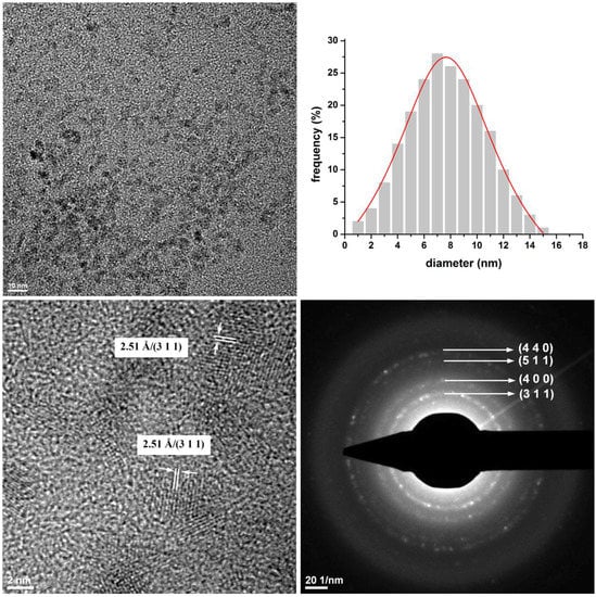 Figure 2. Large-area TEM (top left), size distributions (top right), HR-TEM images (bottom left) and selected area electron diffraction (SAED) (bottom right) of γ-Fe2O3 coated with dextran.