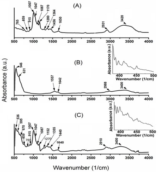 The intensity of the OH vibration mode of crystal water at around 1640 cm−1 due to the adsorbed water molecules in the sample [42] is present in all the spectra from Figure 3. A broad peak at around 3340 cm−1 present in the DIO-NPs spectra corresponds to OH stretching ν(OH). According to Farmer [43] this broad peak may include some contribution from adsorbed water. In the dextran (Figure 3A) spectra, the broad peak corresponding to OH stretching ν(OH) is centered at 3420 cm−1, while in the maghemite spectra (Figure 3B) this broad peak is centered at around 3400 cm−1.