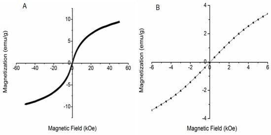 Magnetic measurements of the maghemite-coated dextran was carried out using vibrating sample magnetometer (VSM). Magnetization curves (M-H loop) for the DIO-NPs measured at room temperature are presented in Figure 4. According to previous studies [44,45] the DIO-NPs, shows negligible value of coercivity which indicates the presence of superparamagnetic phase. From hysteresis measurements, the remnant magnetization (Mr) and coercivity fields (Hc) were equal to 0 Oe at 300 K. On the other hand, the calculated magnetization value of DIO-NPs was found to be 9.84 emu/g. The obtained value for magnetization is in agreement with results previously presented by Jiang et al. [46] in their studies on preparation and characterization of poly(glycidylmethacrylate)-grafted magnetic nanoparticles. According to the studies on magnetic monodisperse Fe3O4 nanoparticles conducted by Si et al. [47] low magnetization could be due to the dextran layer on the surface and stabilization of iron particles. On the other hand, Easo and Mohanan [6] in their recent studies showed that the superparamagnetic characteristic of DIO-NPs signifies that these particles have single domains and all magnetic moments are aligned in one direction.
