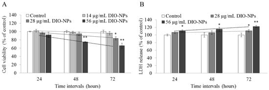 Figure 5. Effects of different concentrations of DIO-NPs on Jurkat cell viability (A) and membrane integrity (B) after 24 h, 48 h, and 72 h. Values were calculated as percentage of treated cells compared to the control and expressed as means ± SD (n = 3/experimental group). * p < 0.05 vs. control; ** p < 0.01 vs. control.