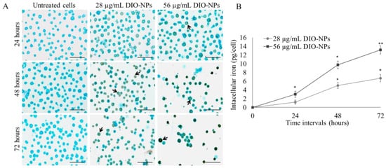Figure 6. Quantification of intracellular iron content. (A) DAB-enhanced Prussian blue staining of Jurkat cells after 24 h, 48 h, and 72 h of exposure to 28 and 56 µg/mLDIO-NPs. Intracellular iron is highlighted by a brown color (black arrows), and cytoplasmin a blue color (LuxolFast Blue staining). Scale bar = 50 µm. (B) Iron content quantified by relaxometry. The values are expressed as means ± SD (n = 3/experimental group). * p < 0.05 vs. control; ** p < 0.01 vs. control.
