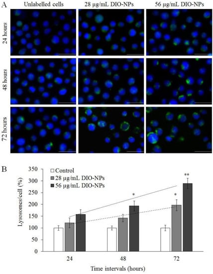Figure 7. Localization and quantification of lysosomes in Jurkat cells treated with 28 and 56 µg/mL DIO-NPs after 24 h, 48 h, and 72 h. (A) Lysosomes (green color) were labeled with Lysotracker green DND-26 and nuclear DNA content with DAPI (blue color). Scale bar = 40 µm. (B) Quantification of lysosomal fluorescence intensity using ImageJ software. Lysosomal area over total number of cells from the selected field of view was calculated as the percentage of treated cells compared to the control and expressed as means ± SD (n = 3/experimental group). * p < 0.05 vs. control; ** p < 0.01 vs. control.