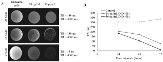 Figure 8. In vitro MRI of Jurkat cells treated with 28 and 56 µg/mL DIO-NPs after 24 h, 48 h, and 72 h. (A) Images acquired at 7 Tesla using a Bruker PharmaScan MRI instrument of gelatin phantoms containing human lymphoblasts labeled with DIO-NPs. (B) Graphic representation of T2 values (ms).