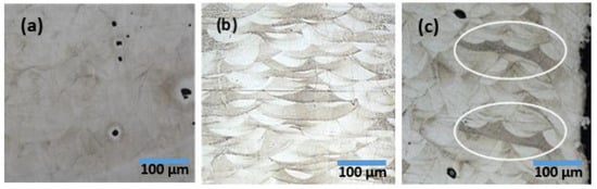Figure 2a shows the cross-sectional views on the x–y (scan direction) plane, while Figure 2b,c shows the cross-sectional views on the x–z and y–z planes (build direction), respectively. These melted scan tracks are representative of the solidified melt pool for each layer on the powder bed. The curved “fish-scale”—like geometries observed in the x–z and y–z (build direction) planes are due to the semi-circular shape of the melt pool and the partial re-melting of successively deposited layers which have been solidified []. These overlapping geometries also demonstrate successful fusion of powder particles and bonding within each layer, similar to the work carried out by Cherry et al. [] and Yasa and Kruth [].