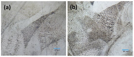 A fine cellular-dendritic microstructure could be observed in the SLM-fabricated samples as shown in Figure 3. This is a common characteristic for metal materials fabricated by AM processes as a result of the rapid solidification rates in the locally melted areas (selectively laser-scanned regions) which were experienced because of short laser-material interaction time during the build process [,,].