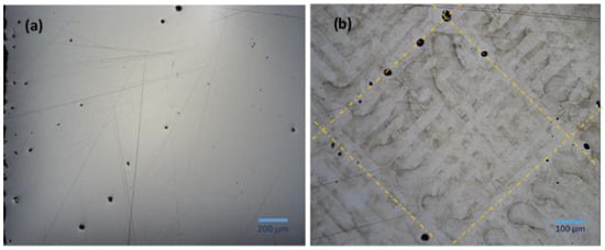 However, the pores were not evenly distributed throughout the cut specimens and some of them were concentrated more in certain areas compared to others. It was observed that for the samples cut along the x–y plane (along the scan direction), the pores were mainly concentrated at the boundary of the “island” which was employed as the scan strategy during SLM in this study (Figure 5). In other words, the pores were located at the overlapping area between two “islands”, similar to the work carried out by Gustmann et al. []. Interestingly, aligned pores appeared regularly along the build direction for the samples cut along the x–z and y–z planes (Figure 6). This could be the result of inclusions such as oxides present upon solidification of the molten pool [,,]. Nevertheless, the porosity content at these regions with a high porosity concentration amounted up to ~1.68%, which is still a small figure as a whole but is relatively higher than the average porosity content calculated.