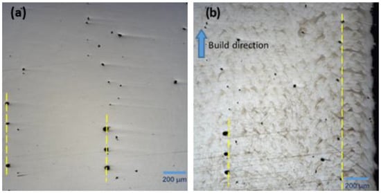Aligned pores at successive solidified layers for: (a) un-etched and (b) etched specimens cut along the x–z plane. Similar results were observed for specimens in the y–z plane.