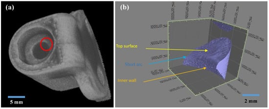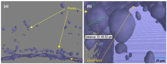(a) Majority of the pores in the CT-scanned sample were observed close to the surface (inner wall) of the region in study; (b) Example of pore shape and size near the inner wall region.