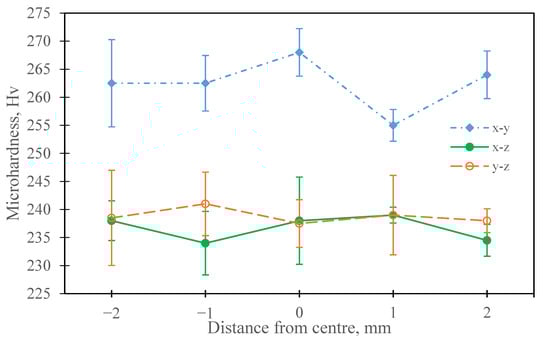The results of the Vickers microhardness (HV) tests were evaluated by: (i) comparing HV values of SLM samples for different cut planes (x–y, x–z and y–z) as shown in Figure 10; and (ii) comparing HV values of SLM and WM samples (Figure 11).