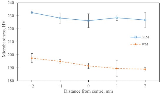 Vickers microhardness (HV) measurements were taken along the cross-sections using FM-300 Microhardness Tester (Future-Tech Corp, Kanagawa, Japan). The distance between each indentation was 1 mm and the applied load was 100 gf with dwell time of 10 s. The measurements at each position were repeated three times and the average HV values were calculated. In addition, HV values were also obtained from the cube-shaped 316L SS sample manufactured by WM using similar testing conditions.