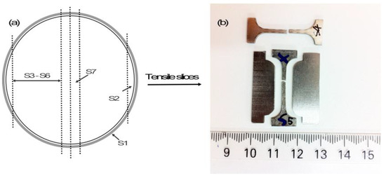 (a) Schematic illustration of the cylinder and the seven slices cut from the cylinder, only slices S3 to S7 were further machined for tensile test and (b) the tensile specimens after fracture. S1 was the outer scale, S2 to S7 were the slices cut from outer slice to the interior slices. S7 slices were cut from the central of the sintered large cylinder.