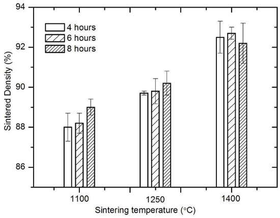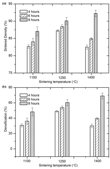 The sintered density (relative to theoretical density) and densification parameter are illustrated in Figure 2, as a function of sintering temperature and holding time. Densification parameter, ϕ, is calculated according to Equation (1) [23]