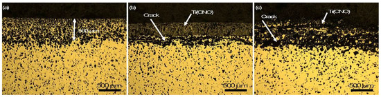 Figure 3 presents an example of the compacts sintered at the three temperatures for 4 h. The metallographic observations of the cross sections of these compacts clearly show a fairly thick contamination scale on the compact surface. This porous layer was 300–500 µm thick, regardless of the sintering temperature. Separation between this layer and the remaining compact is visible. XRD and EDS analyses suggest that this layer is Ti(CNO) [21] and the formation mechanism will be discussed in subsequent Section 4.2.