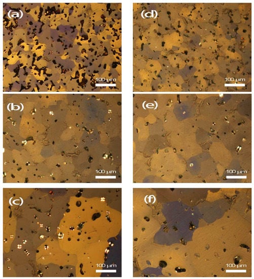 Microstructure of the cross sections of sintered small compacts at various sintering conditions. The micrographs were taken under polarized light microscopy. The compacts were sintered at various temperatures for different holding times: (a) 1100 °C/4 h; (b) 1250 °C/4 h; (c) 1400 °C/4 h; (d) 1100 °C/8 h; (e) 1250 °C/8 h; and (f) 1250 °C/8 h.