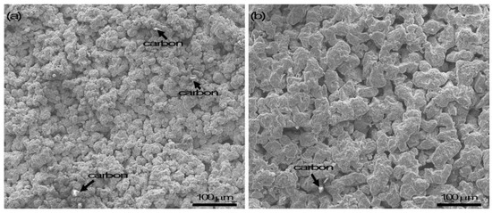 The surfaces of the sintered compacts, regardless of sintering temperature, show powdery morphology (Figure 5). To a much lesser content, some sinter-necks could be found. Shiny carbon particles were also visible on the sample surface. This is validated by the EDS analysis. Further evidence presented in the subsequent Section 3.4 suggests that this thick layer of surface contaminant is a compound containing Ti, C, N and O.