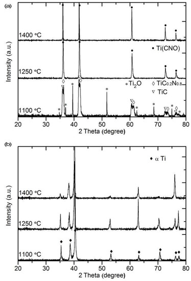 X-ray diffraction (XRD) patterns of the as-sintered small Ti compacts (a) on the surface and (b) cross-sections of compact interior. The compact was sintered for 4 h at 1100, 1250 and 1400 °C, respectively.