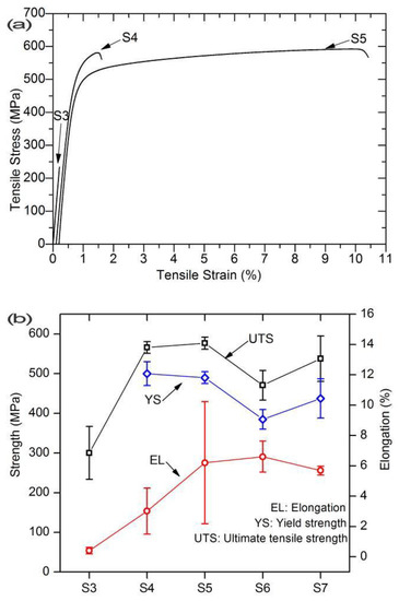 Typical stress–strain curves of the tensile specimens taken from three different positions in the sintered cylinder are shown in Figure 7. The contaminated surface scale was removed from the large cylinder. It is clear that specimen S3, which was taken 2 mm underneath the outermost surface, failed prior to yielding. Specimen S4 sliced 4 mm underneath the outermost surface attained a minor plastic strain of 1.5%. Specimens taken from further inside demonstrated much greater plastic strain—up to 10% for specimen S5. The average tensile properties of the specimens taken from the different positions are presented in Figure 7b. An average of ~6% plastic strain was obtained in the tensile specimens that were taken from the compact interior while a negligible plastic strain for the specimens was taken close to the contaminated surface. For the specimens taken from the interior, the yield strength (YS) was in the range of 385 to 500 MPa and ultimate tensile strength (UTS) varied from 470 to 580 MPa. In addition, the Young’s moduli of all the specimens were similar (100 to 110 GPa), which correspond to the sintered densities (95.3% to 95.9%, Table 1).