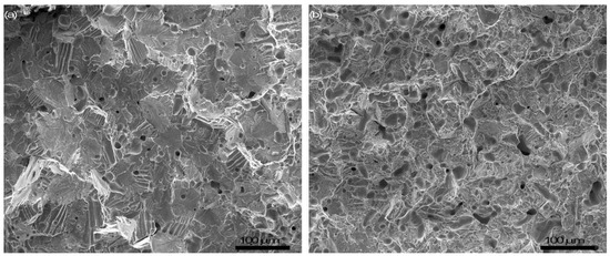Figure 8 shows the fracture surface of the specimens S4 and S5. Smooth facets and river patterns are visible in S4 (Figure 8a), which indicate a brittle fracture mode. On the other hand, many dimples can be found in specimen S5, indicating a ductile fracture mode. Similar fracture features were observed on the fractured surface of specimens S6 and S7.