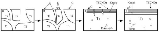 In contrast to the sintered compact interior where only α-Ti phase is present, the surface of the sintered compact is a complex compound Ti(CNO). The carbon is thought to arise from the graphite heating elements and insulation liner material within the furnace, while nitrogen may originate from backfilled argon and oxygen from the raw powder and argon. In order to further understand the formation of the surface scale resulting from the contamination of interstitials, a formation mechanism is schematically shown in Figure 10.