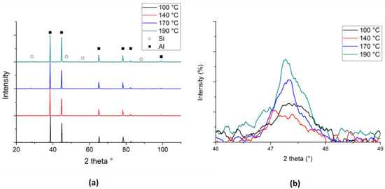 In Figure 3a, it is possible to note that the X-ray diffraction (XRD) patterns of the samples built at different temperatures are similar. Only a slight increase in the intensity of silicon peaks can be observed in the samples built with higher building platform temperature (Figure 3b). The higher intensity of Si peaks in XRD of the samples built with higher building platform temperatures could be due to further precipitation of Si in the eutectic region at higher building platform temperatures. The silicon moves, in fact, inside the fine eutectic phase [27] (bright regions in Figure 2), from a supersaturated solid solution to Si stables precipitates [18]. Furthermore, no traces of the Mg2Si strengthening phase were observed in the XRD patterns of the A357 samples built at different temperatures, probably because its relative quantity is lower than the X-ray detection limit.