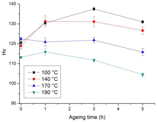 Micro-Vickers hardness values of the A357 samples during direct-ageing treatment at 170 °C.