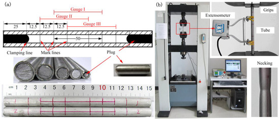 Tube specimens were cut based on the Standard GB/T 228-2002 [33]. In order to ensure the uniaxial tensile condition, two metal cylindrical plugs were inserted from the two open ends of each tube. The plugs were specially machined with a round top for easy operation. During tension, the grips clamped the two ends of the tube with plugs inserted. The dimension of tube samples and the plugs are shown in Figure 1a. Previous test experience shows that fracture may occasionally not occur in the middle of the tube. In order to ensure that the fracture occurs within the gauge length, two more pairs of marked lines (Gauge II and III) were drawn on the surface of each specimen besides the usual one in the middle part (Gauge I). Once the fracture occurs outside Gauge I, Gauge II or III could be selected for gauge length measurement according to the fracture location. WDW-E100 universal testing machine (Jinan Shijin Group Co. Ltd., Jinan, China) was used for the test, Figure 1b. Constant loading speed v = 2.5 mm/min was selected. Tension stopped once tube samples fractured. Strain level was recorded with an extensometer until 5% extension.