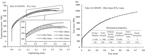 Material properties: (a) Engineering stress–strain curves of different sizes 1Cr18Ni9Ti tubes; (b) True stress–strain curve and mechanical properties of 1Cr18Ni9Ti with OD0 = 8 mm WT0 = 1.