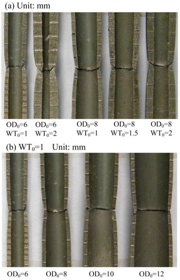 After tensile test, all the samples were cut along the axis of the tube. Figure 3 shows the shapes of the tube walls at fracture area with different outer diameters and wall thicknesses. It can be clearly seen that both inner diameter and outer diameter at necking region shrank after tube fracture. Here we define the original inner and outer diameters are ID0 and OD0 and the inner and outer diameters after fracture are IDf and ODf, respectively. Figure 3a shows that the shrinkage ratio of OD ((OD0 − ODf)/OD0) increases as the original wall thickness WT0 increases. The dimensional change of ID is slightly different. From the observation of Figure 3a,b, it can be found that the shrinkage ratio of ID ((ID0 − IDf)/ID0) decreases as the thickness-diameter ratio WT0/OD0 increases. More details are discussed later.