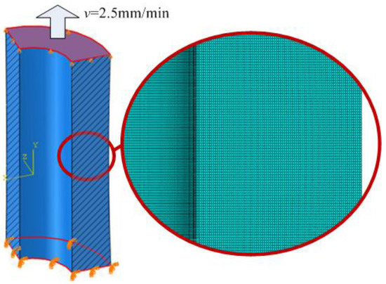 Commercial finite element code Abaqus 6.10 (SIMULIA by Dassault Systèmes, Waltham, MA, USA) was used to model the uniaxial tension of tubes. Only a quarter tube with 12 mm length was modeled to save computation time, Figure 4. Three-dimensional hexahedral solid elements C3D8R were used in the model. Two-dimensional axial symmetric elements were not used in this study because the model will be used in future bending simulations, which are not axial symmetric forming processes. In order to accurately capture the stress–strain state during necking and fracture, a consistent finer element size (0.02 mm × 0.02 mm × 0.02 mm in necking zone) was used to mesh the critical area locally for all the tube sizes. The material’s stress–strain curve and material properties in Figure 2b was used as FEA input. Although anisotropy can be caused by the rolling process of the tube, it is difficult to quantify the anisotropy coefficient. Thus, it is assumed in FEA modeling that the tube is isotropic. All six degrees of freedom were fixed at the bottom surface. A 2.5 mm/min velocity was set as the boundary condition at the top surface, which is the same as the loading condition in experiment. Symmetric boundary conditions were applied to enforce the axial symmetry.