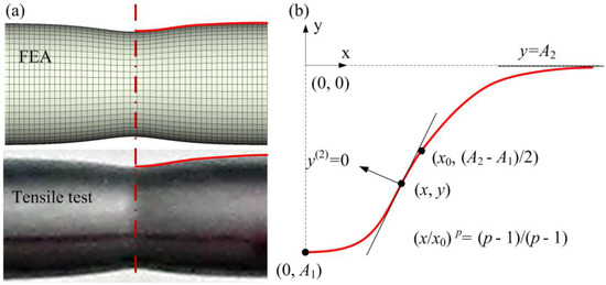 It is found that the outer wall profile in the necking region can be described using a logistic regression model, as shown in Figure 5. The red dotted line in Figure 5a is the center line of the necked tube. The shapes of the tube on both sides of the center line are symmetrical. Red lines shows the profile of the necked tube in both FEA and tensile test (Figure 5a) have the same trend with the logistic regression model (Figure 5b). Logistic regression was developed by statistician David Cox in 1958 [36,37]. The logistic function is shown below.