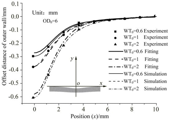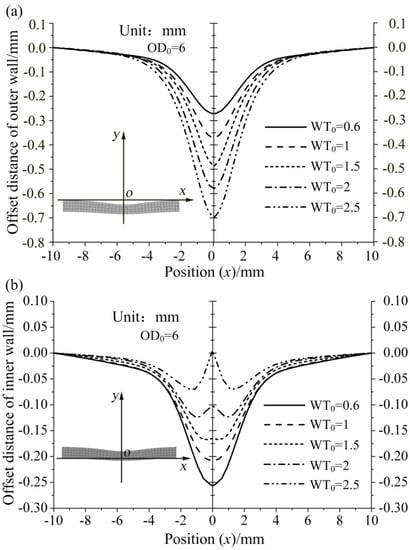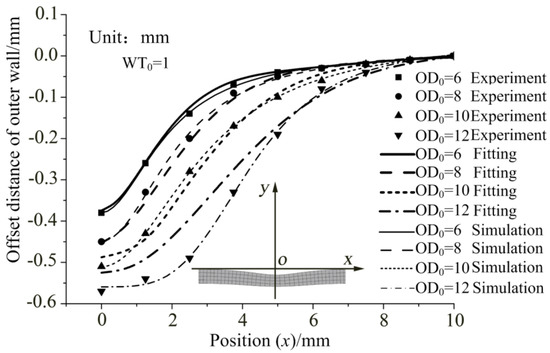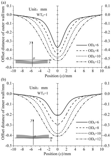 Figure 9 shows the effect of OD0 on the tube’s surface profile. It indicates the offset distances of both outer and inner walls reach maximum at x = 0 (both ODf and IDf reach the minimum values). The offset distances of both outer and inner walls increase as OD0 increases. Also, the rate of increase slows down as OD0 becomes larger. When OD0 increases from 10 to 12 mm, the shrinkage of ODf is 0.038 mm, while the shrinkage of IDf is only 0.014 mm. This means the offset distances of the inner wall becomes less affected as the tube OD0 becomes larger and larger.