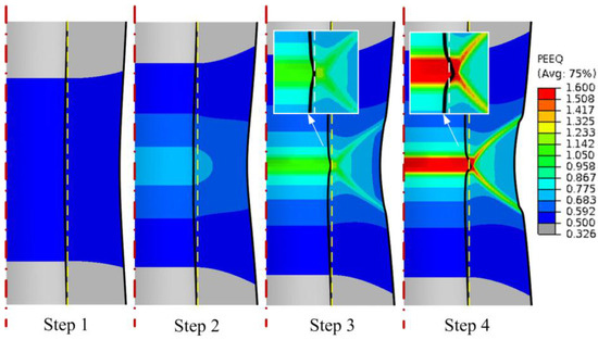 Figure 11 shows an equivalent plastic strain contour in the quarter model of a tube with OD0 = 8 mm and WT0 = 2 mm. At the beginning of necking (Status 1 and 2), the inner wall moves inwards. At Status 1, the strain in the wall of the tube is still uniformly distributed in the middle section of the tube. From Status 2, higher strain starts to concentrate at a small local area, which indicates the necking effect is becoming obvious. At Status 3, the necking effect is very significant and two necking bands have formed. High strain concentration is shown within the necking bands. A local area on the inner wall surface where two necking bands intersect starts to move outwards. Status 3 is a special moment when the offset distance of the inner wall in the middle of the necking zone is equal to that at the straight section of the tube. At Status 4, the ID at the same location grows larger and ultimately causes fracture.