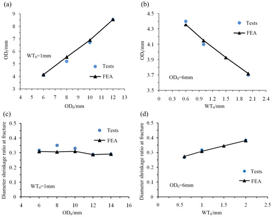 Figure 12 shows the influence of OD0 and WT0 on the diameter of the neck at fracture, ODf. The data from FEA are the smallest outer diameter of the tube when the fracture just begins. Since it is difficult to judge when the fracture will begin and stop the tension without delay during the experiment, ODf from tensile tests are measured after fracture. The FEA results are in good agreement with the experimental data. Figure 12a,b shows that when WT0 remains constant, ODf increases linearly with increasing OD0. When OD0 remains constant, ODf decreases linearly as WT0 increases. In Figure 12c, the tube diameter shrinkage ratio at fracture is defined as (OD0 − ODf)/OD0. It can be observed that when WT0 remains constant, the shrinkage ratio of outer diameter at fracture changes very little and generally maintains at around 0.31. And in Figure 12d, when OD0 remains constant, the shrinkage ratio increases linearly with WT0. This is why ODf is linearly proportional to OD0 and is inversely linearly proportional to WT0.
