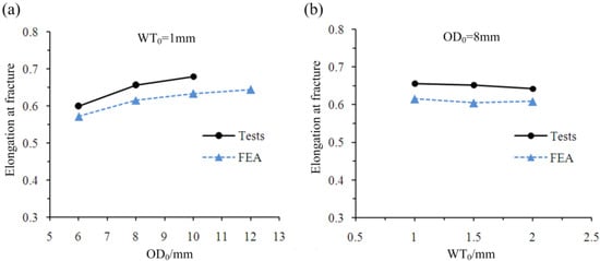 Effect of (a) original diameter and (b) original wall thickness on the elongation at fracture.