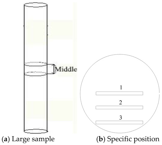 Positions of the H13 steel samples: (a) Large sample taken from the middle of the ingot after annealing; (b) Individual test samples taken from the center (#1), half-radius (#2), and outer surface (#3) of (a) after tempering.