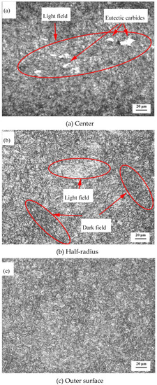As shown in Figure 3, the microstructure of H13 after tempering includes martensite, fine-grained pearlite, and a large number of carbides. The heterogeneity of the microstructures is obvious both at the center and at the half-radius of the ingot (Figure 3a,b). Light field represents the alloy-rich and carbide-rich field, while the situation is opposite in the dark field where the carbides dissolve and martensite forms [13]. Especially in the center, there exist segregation bands composed of eutectic carbides, as shown in Figure 3a. Compared with the center and the half-radius of the ingot, the microstructures near the outer surface (Figure 3c) are much more homogeneous and appear to have the narrowest martensite laths.