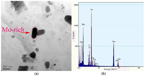 Precipitates of Mo-rich carbides at half-radius of the H13 ingot after tempering: (a) Morphology by TEM; (b) EDS analysis.
