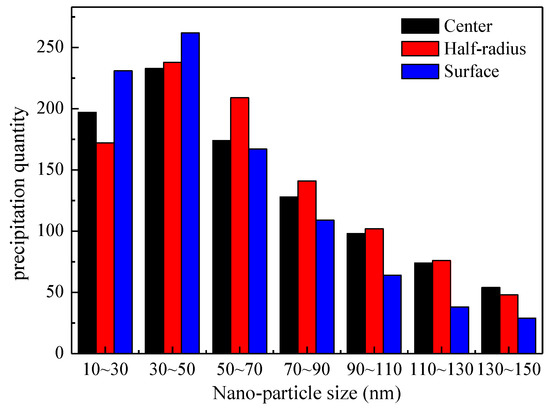 The precipitation quantities in different particle size ranges (<150 nm) of these three positions is shown in Figure 8, and it can be seen that: