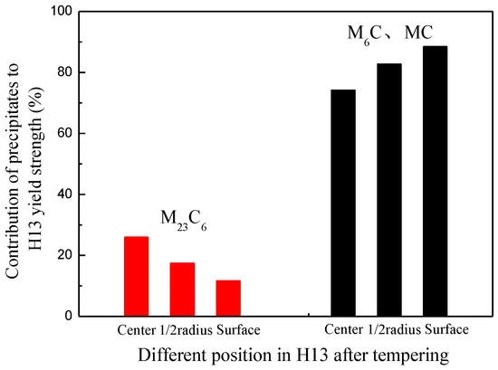 From Figure 9, it can be seen that MC and M6C have a stronger strengthening effect than M23C6 on H13 yield strength, contributing 74%–88% of precipitation strengthening. From the center to the surface of the H13 ingot, the contribution of M23C6 to the yield strength decreases, while the contribution of MC and M6C to the yield strength increases. It can be concluded that MC and M6C are the main carbides in precipitation strengthening. These carbides have good tempering stability as their average size is below 200 nm.