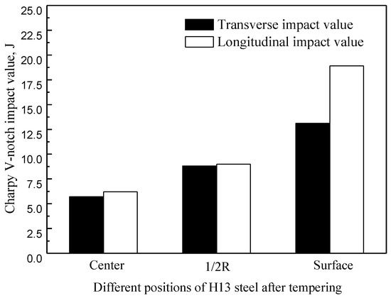 The transverse and longitudinal impact values at the center, half-radius, and surface of H13 after tempering for 2 h are shown in Figure 10.
