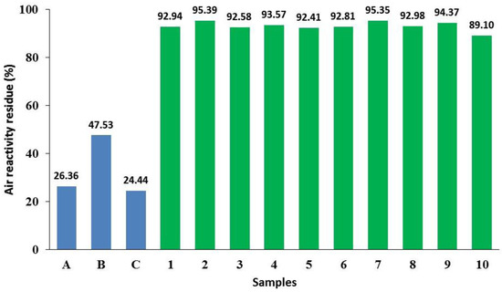The air reactivity tests were performed in a muffle furnace with an airflow of about 5 L/min. The samples were put in the furnace, heated to 525 °C and maintained at this temperature for 2 h. The temperature was then decreased to 500 °C over 1 h and maintained at this temperature for 2 h. The temperature was then decreased to 450 °C and maintained until the end of the test. Samples were then withdrawn from the furnace and weighed. The residue was calculated according to the following equation:
