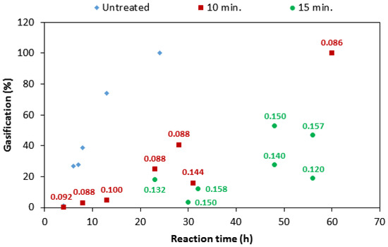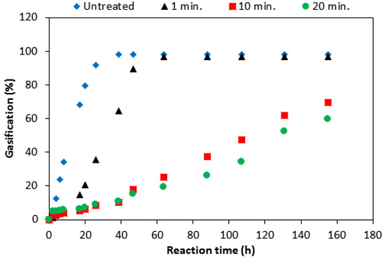Gasification vs. reaction time during gasification for a series of samples with different impregnation times.
