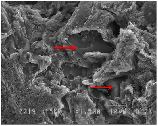 Figure 4 shows a SEM (Scanning Electron Microscopy, JSM-840A, JEOL USA, Inc., Peabody, MA, USA) image of the cross section of an impregnated sample. One can observe lamellar boron oxide crystallized inside the pores. The protection effect can be explained by this observation, since boron blocks the pore surface and limits the access of oxygen. However, the relatively small areas covered by boron oxide cannot explain the significant decrease of the reaction rate. Boron oxide is likely also present on the other areas but, due to the limited resolution of SEM, it is not observed.